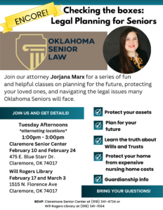 Oklahoma Senior Law attorney Jorjana Marx presents a series of helpful classes on planning for the future, protecting your loved ones, and navigating the issues many Oklahoma Seniors will face.